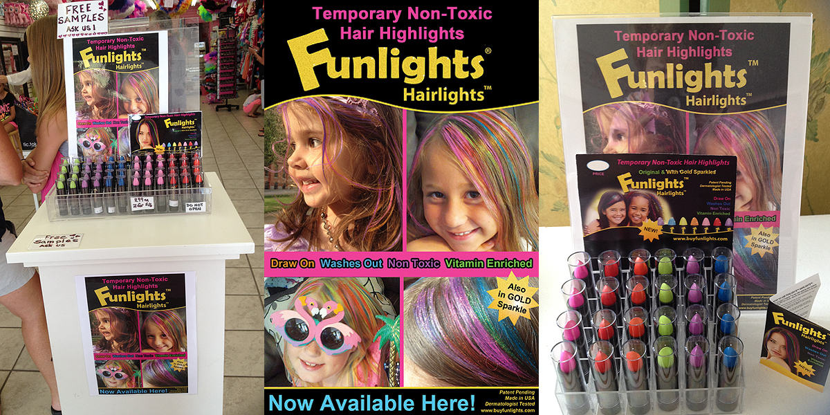 Funlights® Hairlights™ is the new innovative hair color craze for children of all ages. From award-winning inventor Andrea Rose®; Funlights® Hairlights™ is non-toxic, vitamin-enriched, temporary hair color that washes out, and made in the U.S.A.